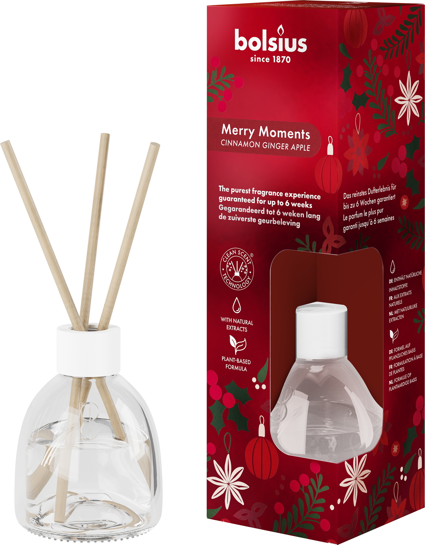 Con la fragancia ambiental True Glow de Bolsius, podrá crear un ambiente cálido en su hogar en un abrir y cerrar de ojos. Durante un máximo de 6 semanas, la fragancia ambiental desprende aromas invernales en sus espacios vitales y garantiza momentos acogedores de bienestar una y otra vez. Su fórmula a base de plantas está enriquecida con extractos naturales.