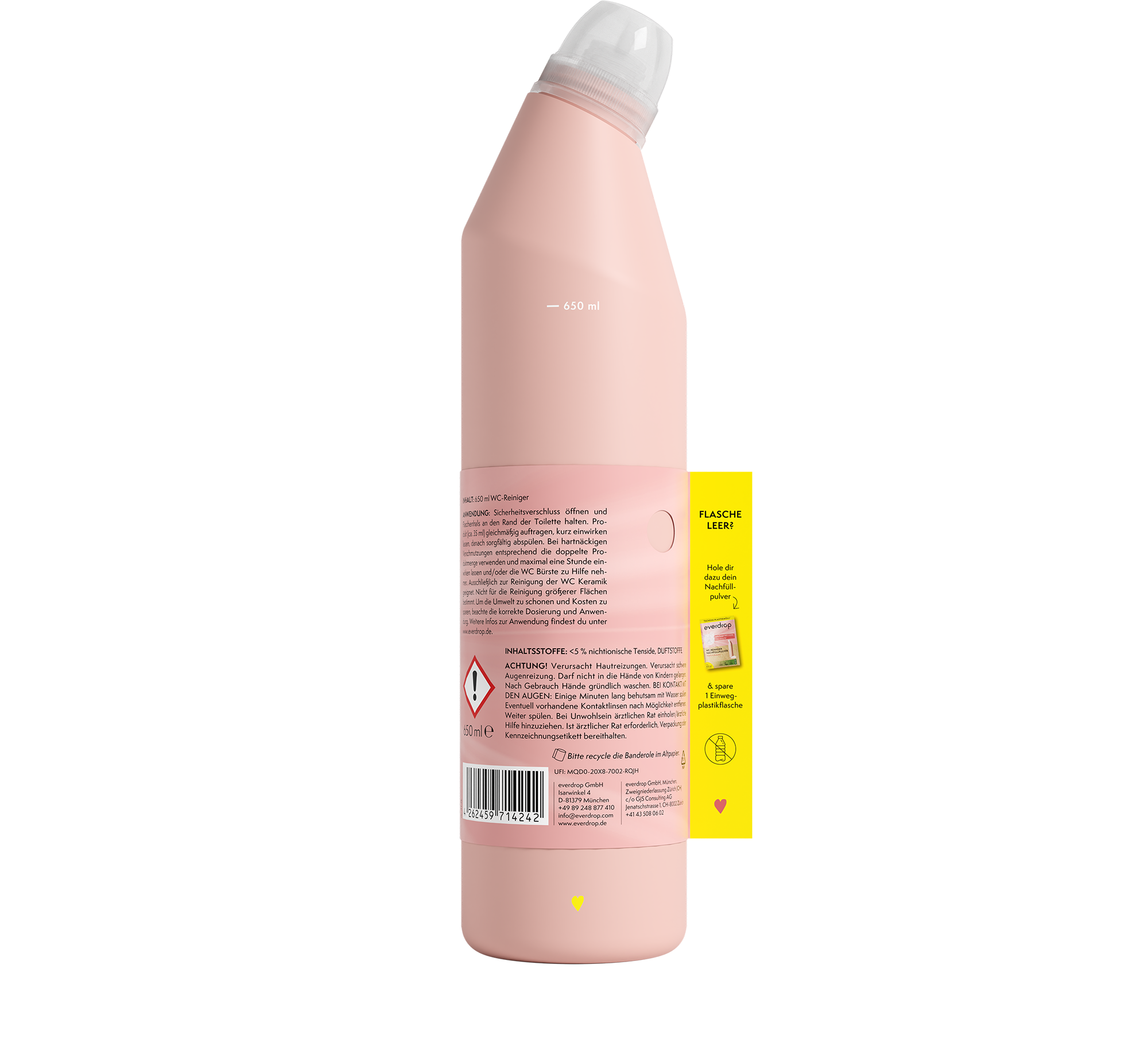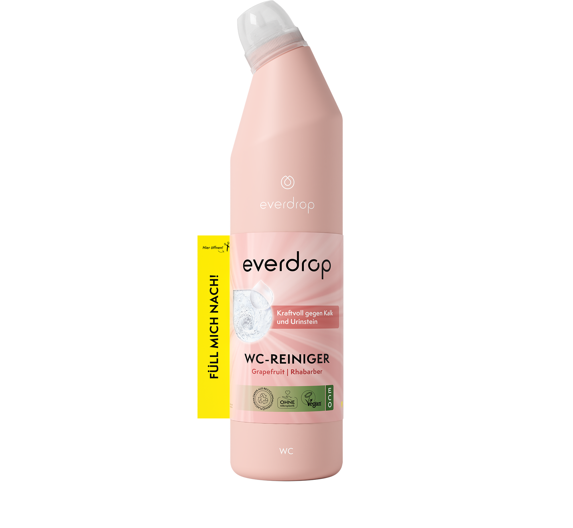 Una vez que se acaba el limpiador, puedes rellenarlo fácilmente gracias al innovador principio everdrop. El recambio en polvo te permite diluir tu nuevo limpiador para inodoros con agua. Gracias a este práctico sistema, no solo eliminas muchos envases de plástico de un solo uso, sino que también reduces significativamente las emisiones de CO₂ durante el transporte.