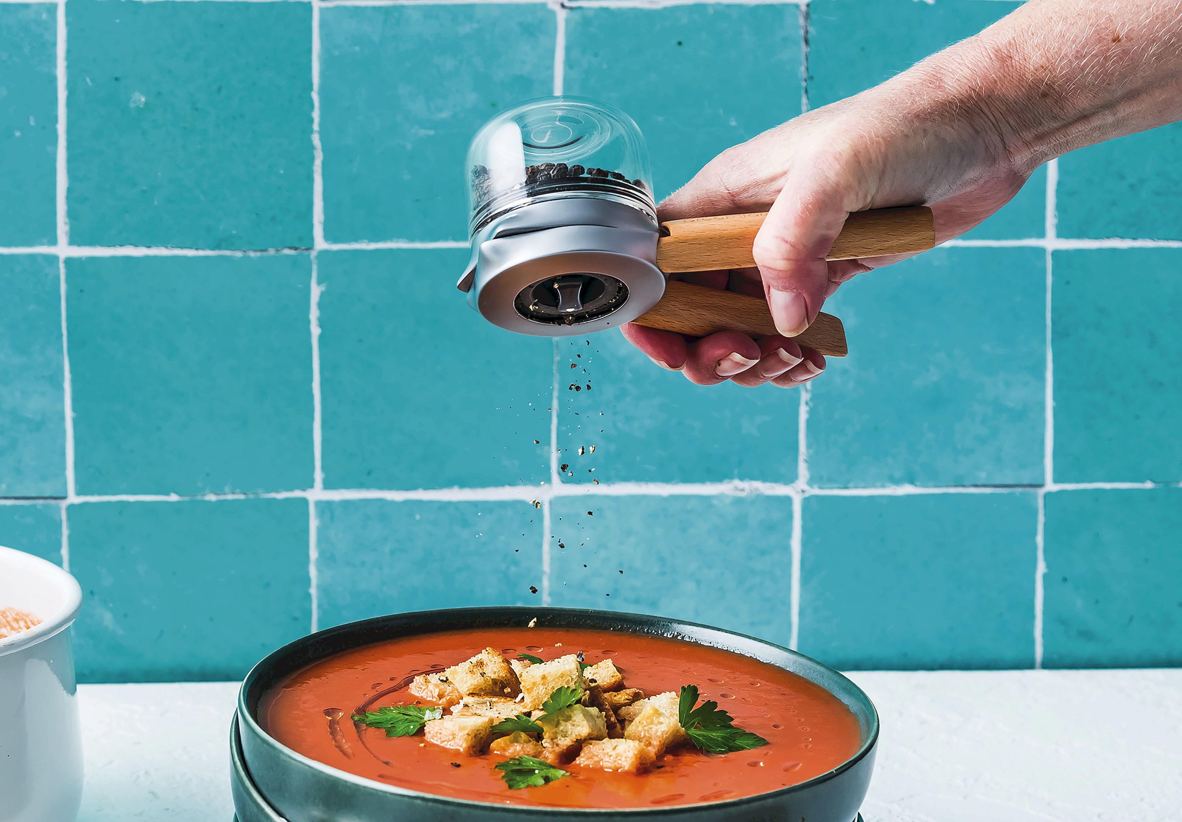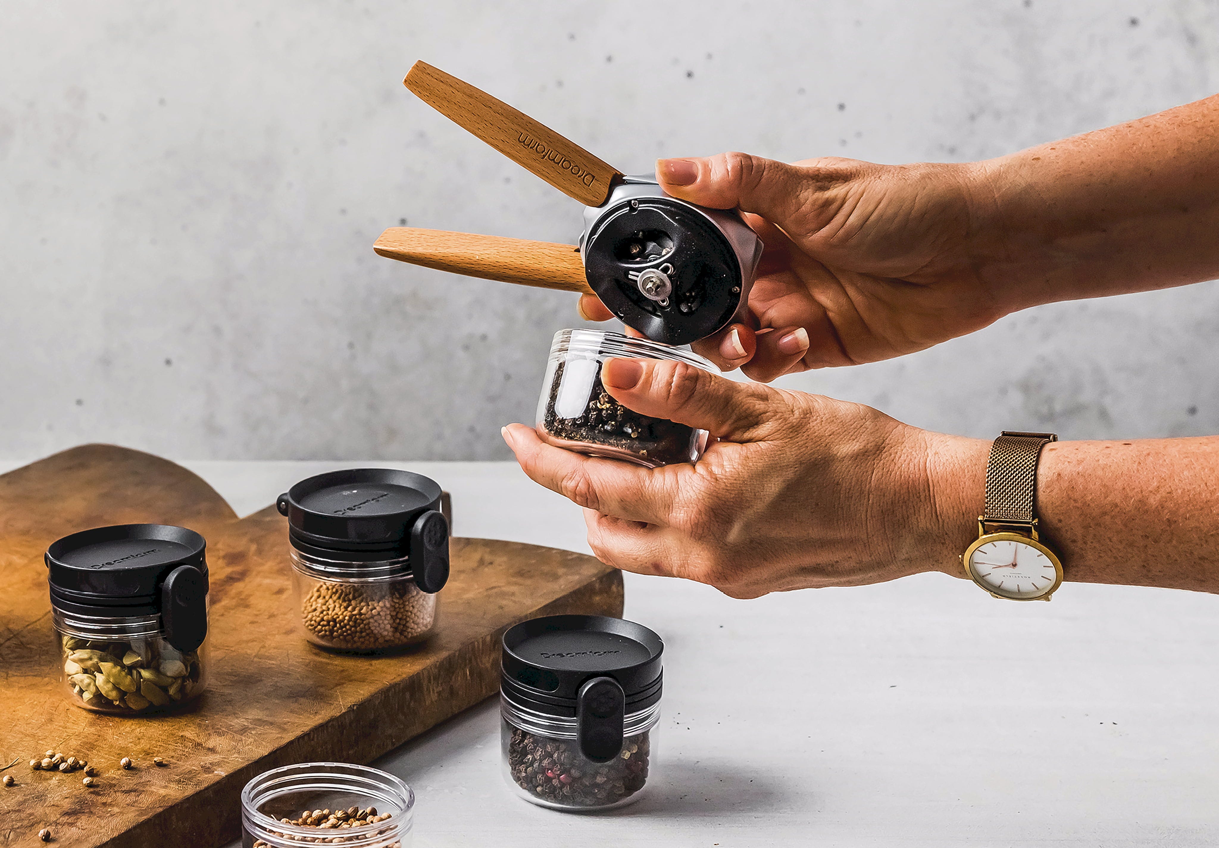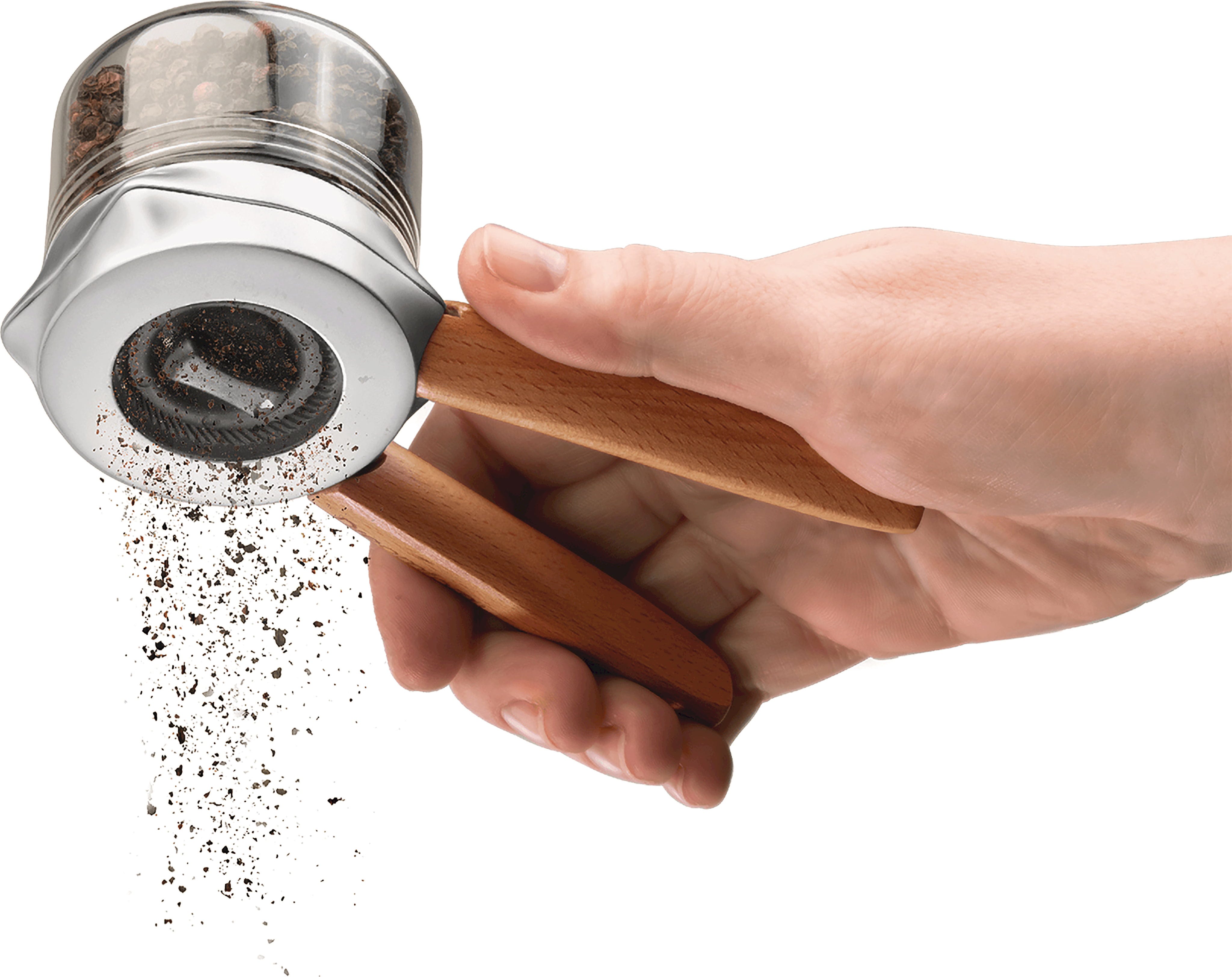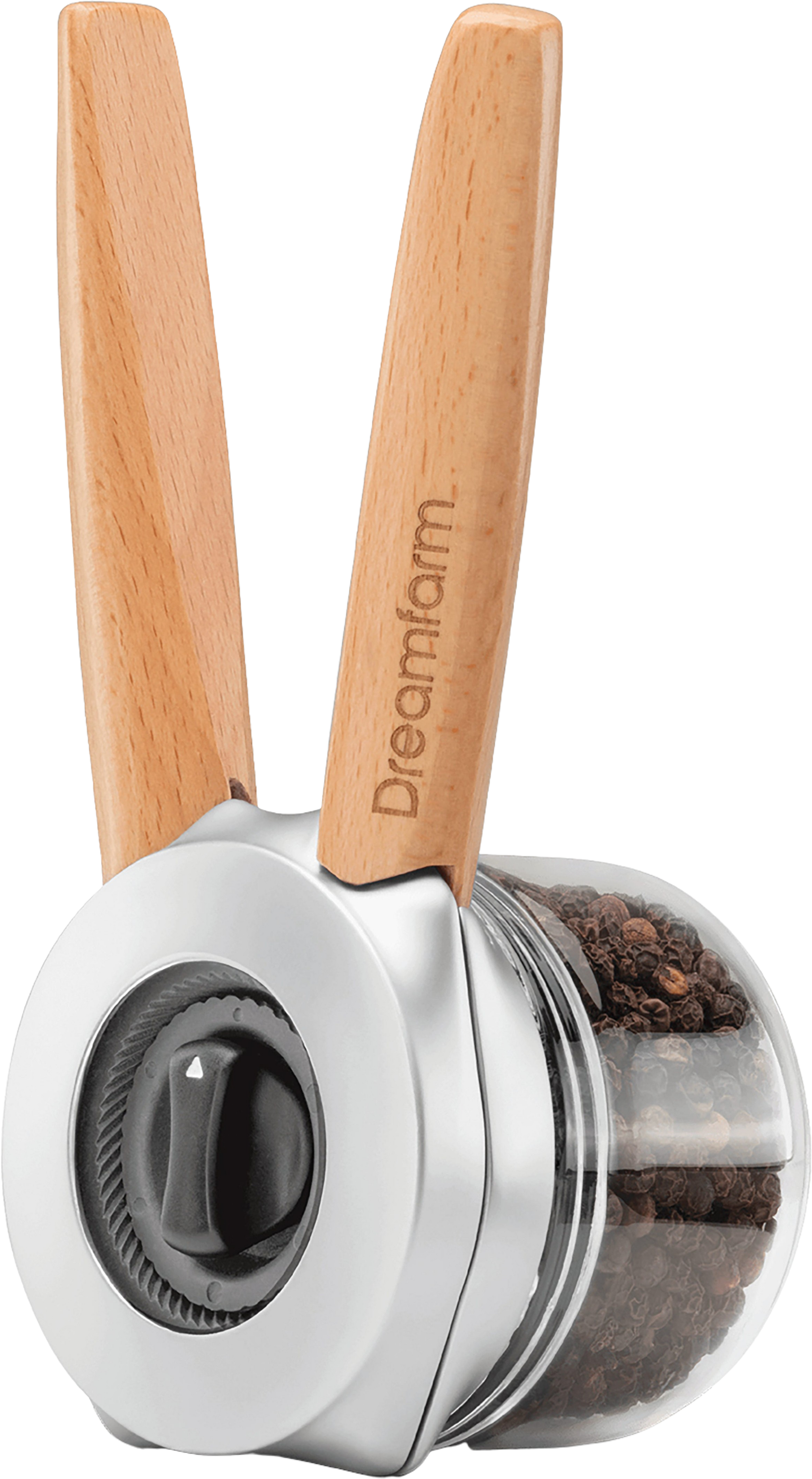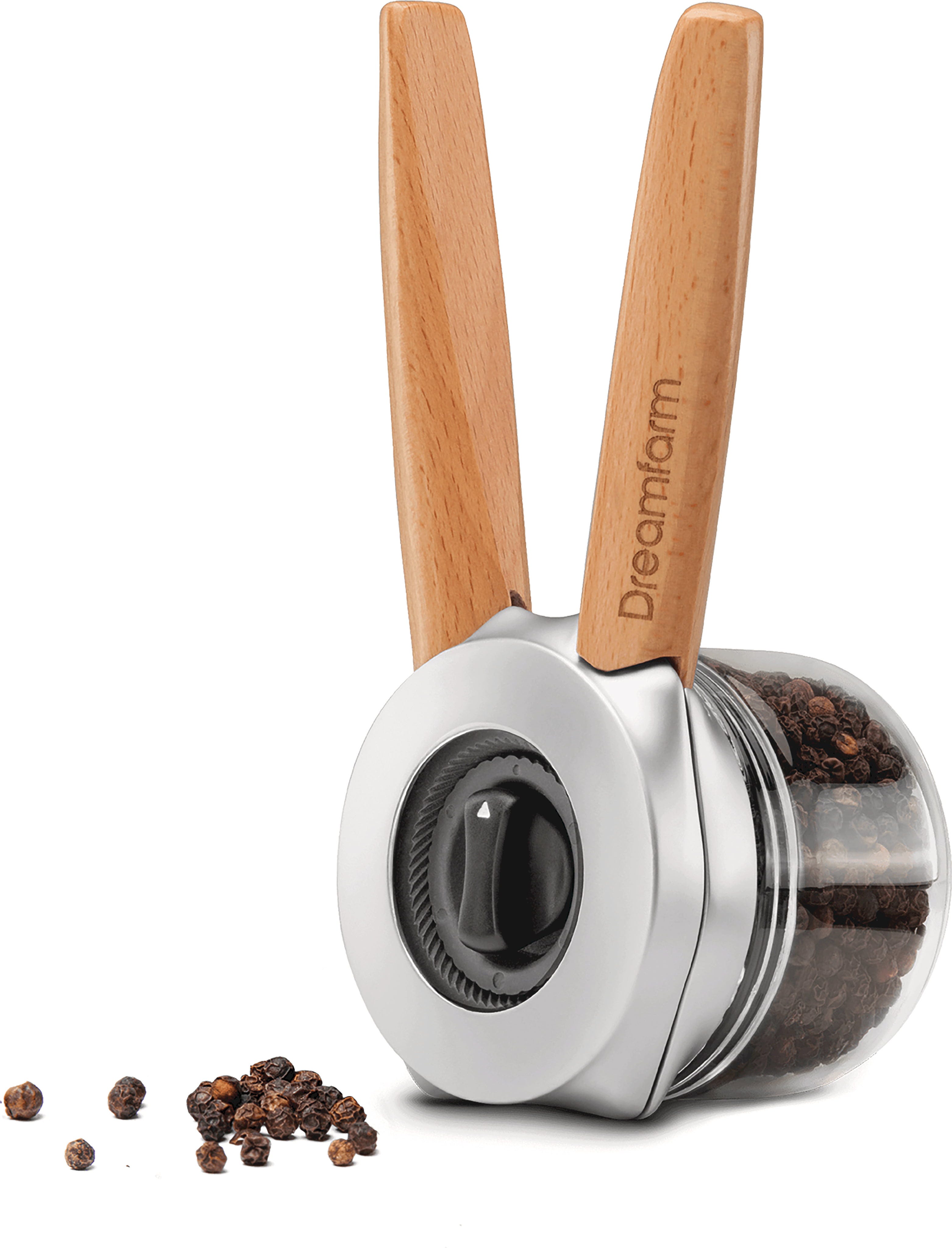 El molinillo Ortwo de Dreamfarm es el primer molinillo del mundo que combina la practicidad de su uso con una sola mano con la velocidad de molienda con las dos manos. Al apretar las asas, puedes moler rápidamente las especias con una sola mano, mientras que al utilizarlo con ambas manos obtienes una mayor cantidad de especias en menos tiempo.