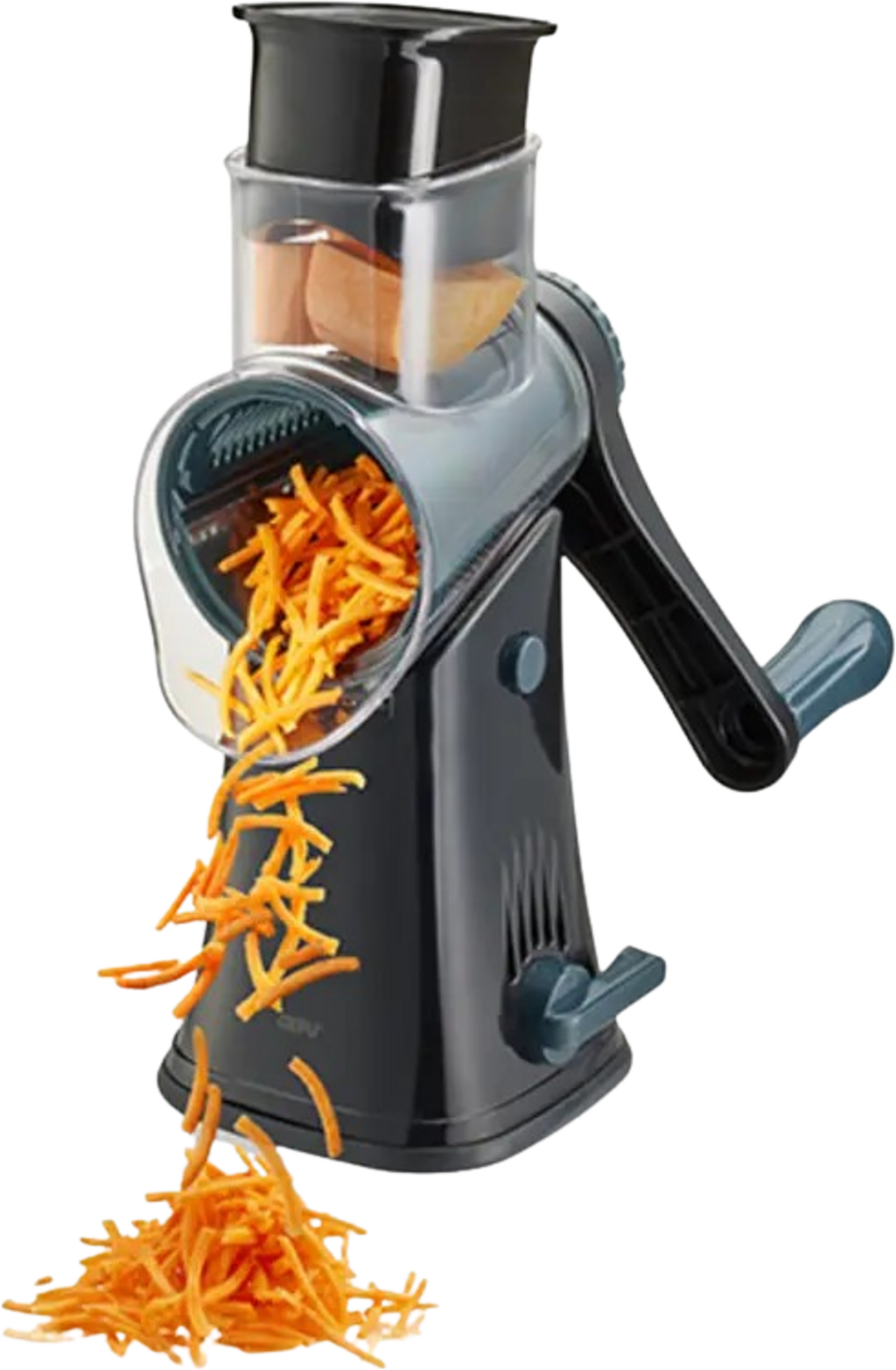 Inserta el tambor deseado, gira la manivela y obtendrás resultados consistentes al instante. La base con ventosa antideslizante garantiza una sujeción segura durante el uso, mientras que la altura del soporte permite colocar cómodamente incluso tazones altos debajo del rallador. Incluye un empujador para empujar los ingredientes con seguridad. Fabricado en plástico resistente y acero inoxidable, el marco superior es extraíble, lo que facilita su limpieza. También incluye una práctica caja para guardar los tambores.