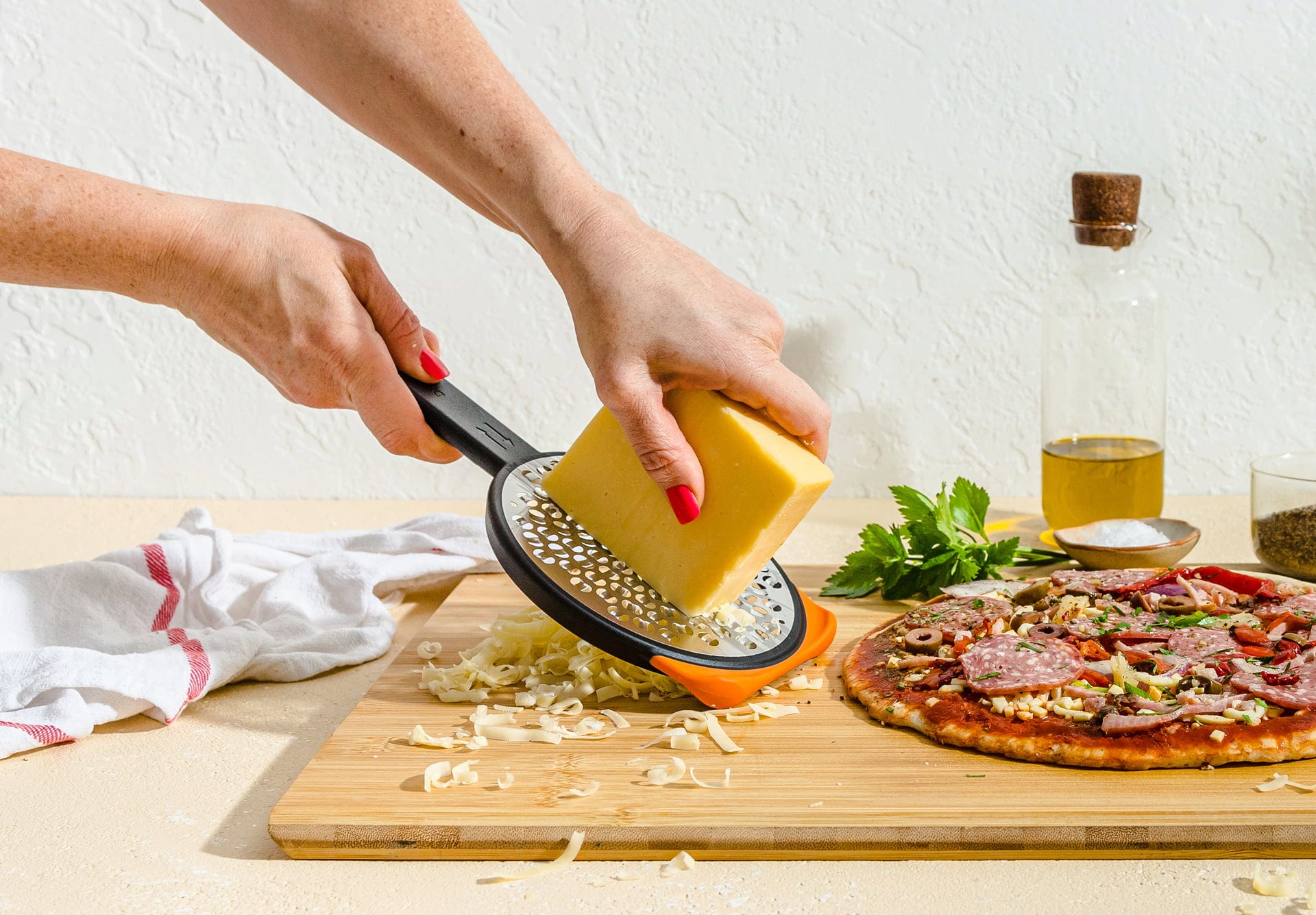 Utiliza el lado delantero para el rallado clásico de arriba abajo o el lado trasero para movimientos circulares rápidos, que te ofrecen aún más velocidad con el máximo control. La base antideslizante de silicona garantiza además una estabilidad perfecta sobre la encimera, lo que te permite rallar de forma segura y sin esfuerzo.