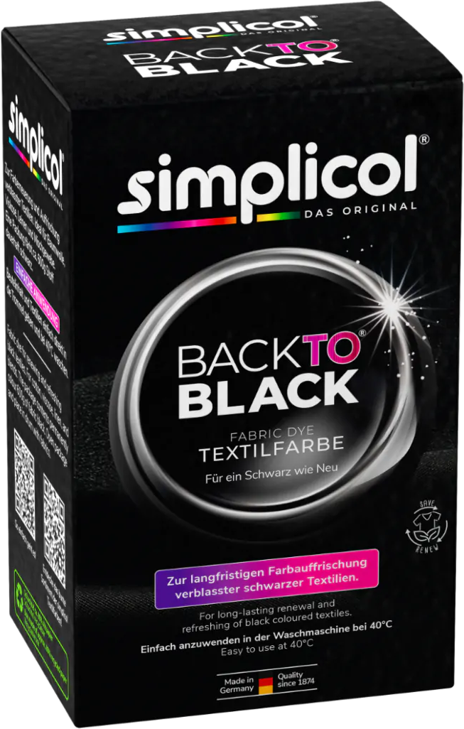Dale otra oportunidad a la ropa negra descolorida y lávala con el tinte para tejidos BACK TO BLACK de simplicol. El colorante es fácil de usar y no mancha.