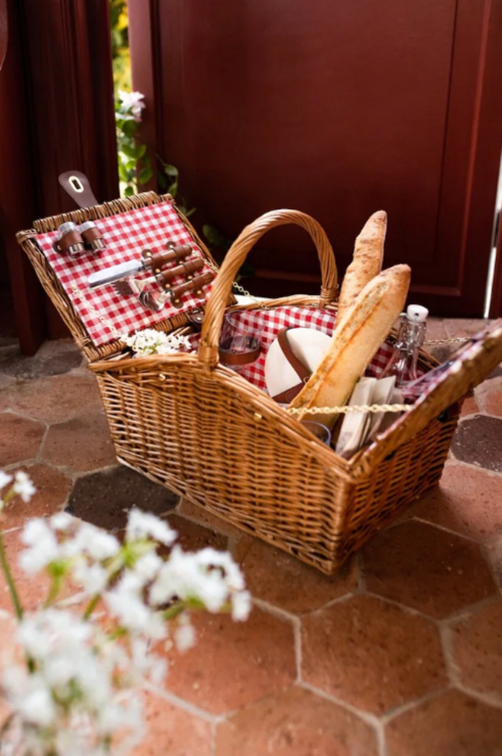 Contenido: 1 bolsa térmica extraíble, 1 set de salero y pimentero de acero inoxidable, 1 sacacorchos con mango de madera, 4 copas de vino de PS (irrompibles), 4 platos de cerámica (resistentes y aptos para el lavavajillas), 4 sets de cubiertos con mangos de color madera