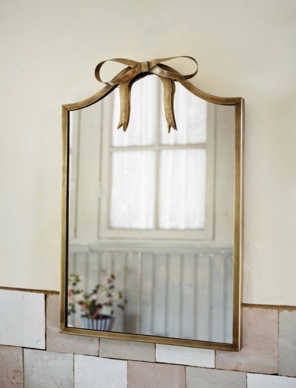 Este espejo arqueado aporta un cálido toque vintage a cualquier estancia gracias a su marco de color latón envejecido y su elegante rosetón. En el cuarto de baño, el dormitorio o la entrada, es práctico y decorativo, y ha sido fabricado por artesanos expertos en condiciones justas.