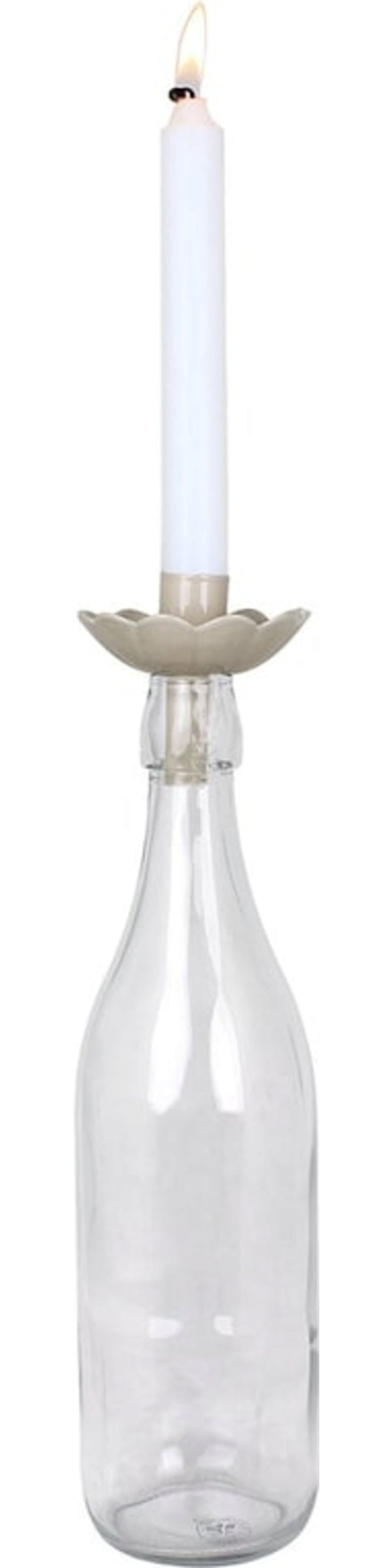 Este innovador portavelas, para colocar sobre botellas vacías, se caracteriza por un diseño exquisitamente retro. El accesorio está pintado a mano y tiene una parte inferior diseñada para recoger las gotas de cera caliente que podrían estropear las superficies.