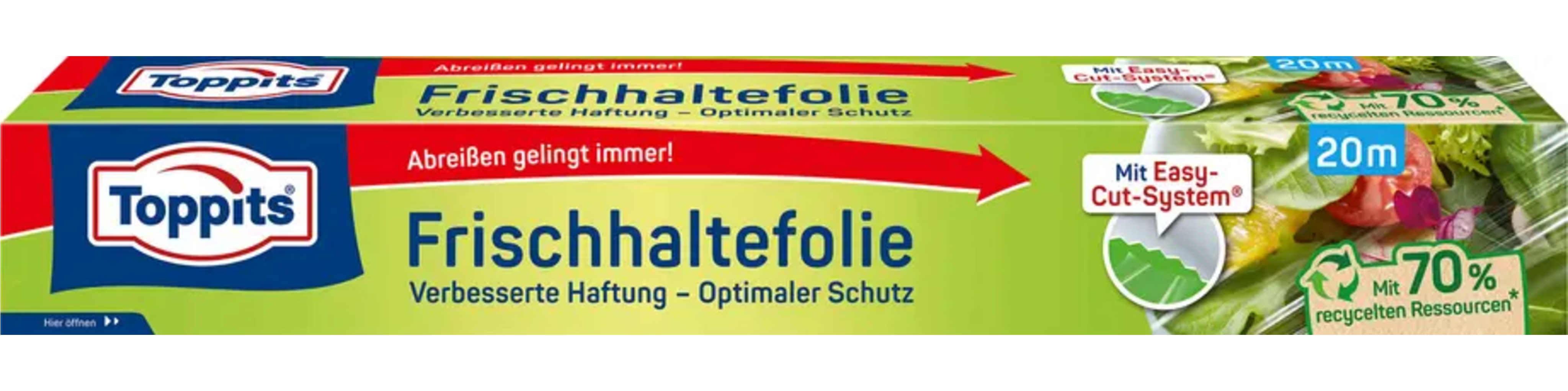 El film transparente Toppits es una solución versátil y autoadhesiva, ideal para cubrir rápidamente los alimentos y conservarlos de forma higiénica. Gracias al práctico sistema Easy-Cut-System®, se corta fácilmente y con precisión, garantizando un corte limpio y sin esfuerzo.