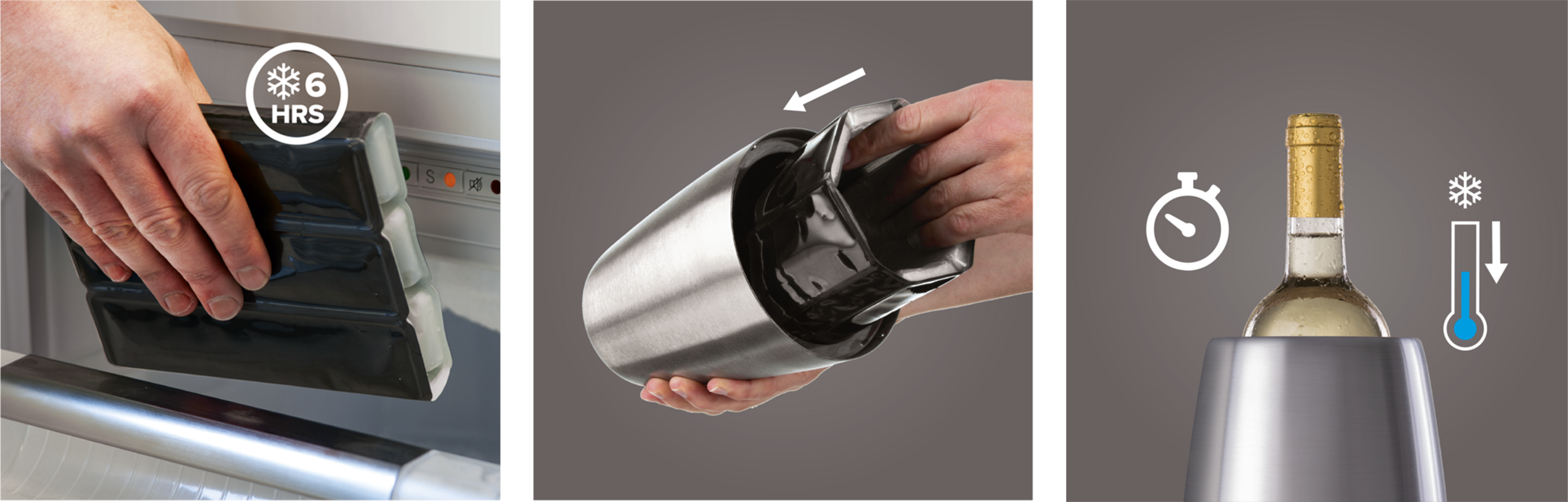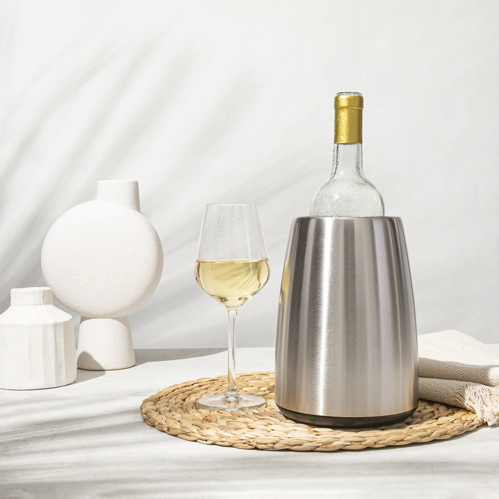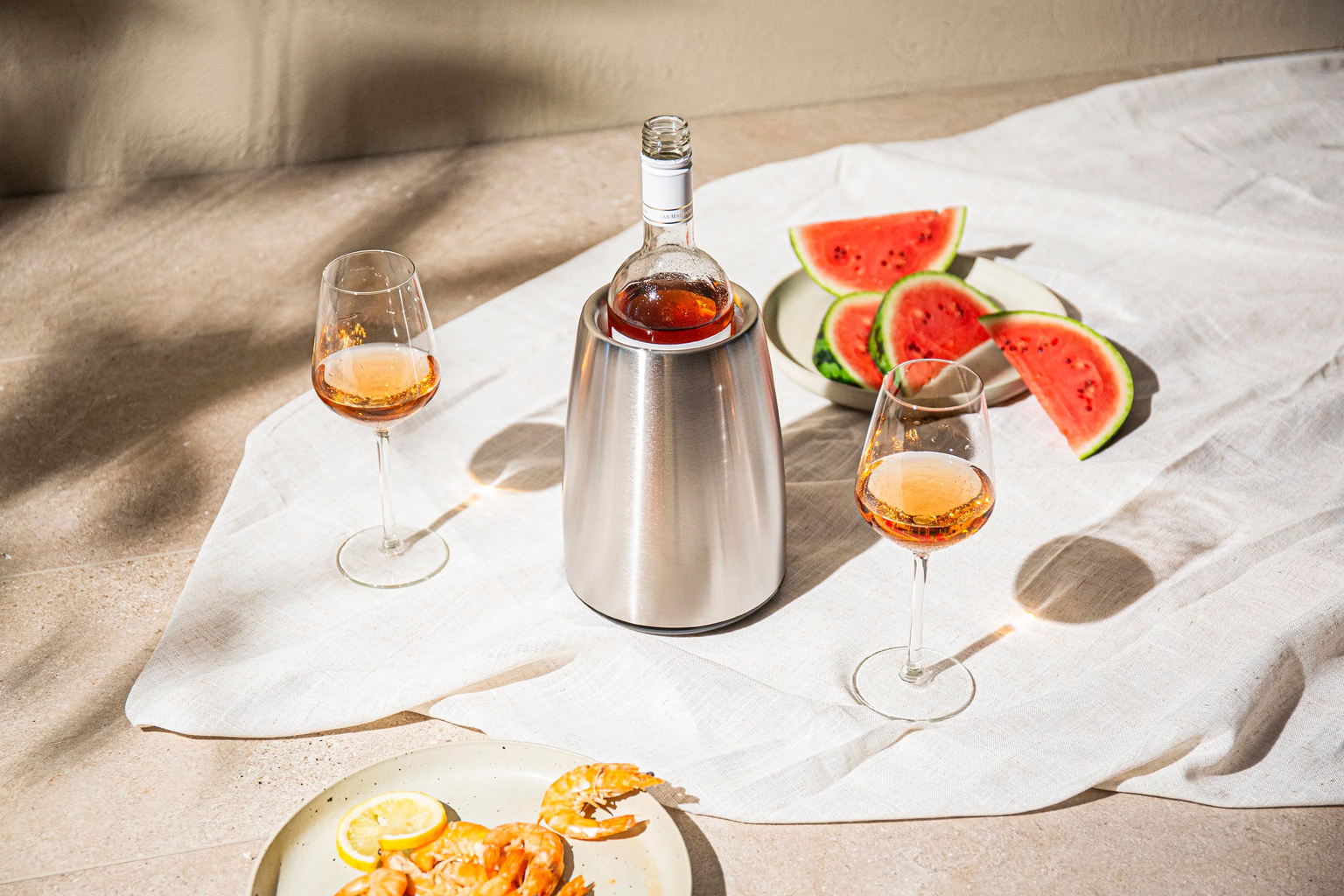 El enfriador de botellas Elegant de Vacu Vin lleva tu vino a la temperatura ideal en solo 15 minutos y lo mantiene agradablemente fresco durante horas.