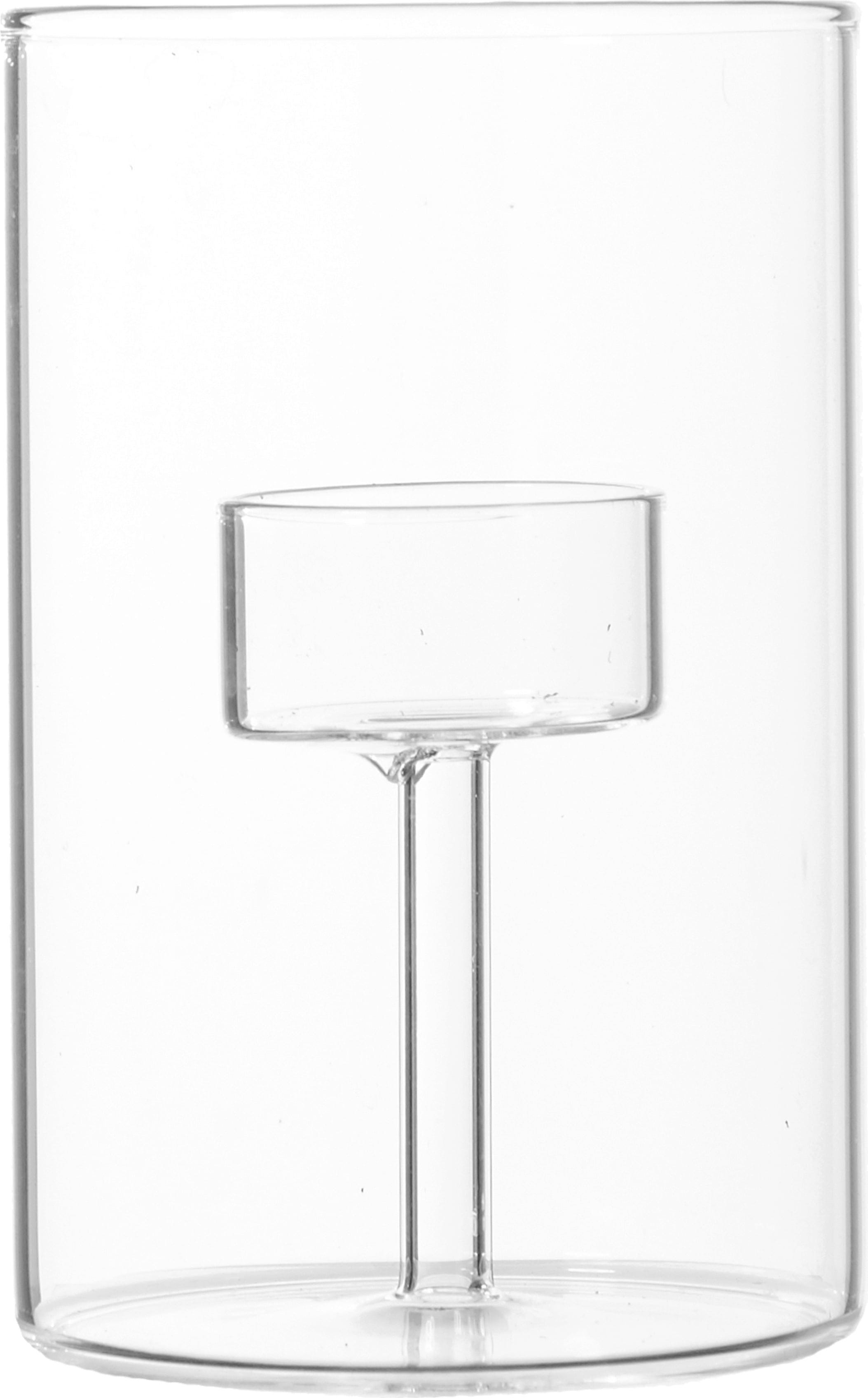 Este refinado portavelas de cristal transparente combina un diseño moderno con la cálida y evocadora luz de la vela, y es el accesorio ideal para interiores decorados en estilo minimalista.